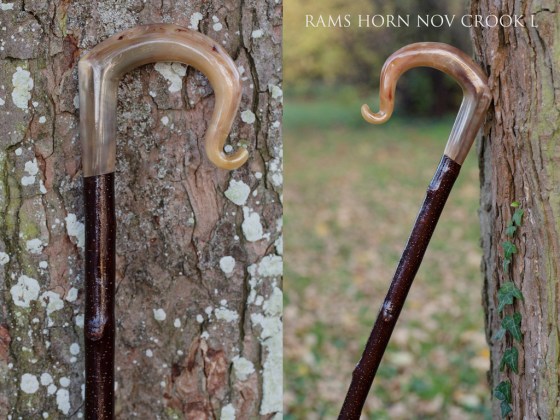 Rams Horn Nov Crook P – The last of the bunch and possibly the last available crook this year. A very nice buffalo horn crook with single ox horn spacer on hazel shank. A beautiful bit of buffalo horn, polished up and ready to get mucky in the field. Measuring 52″ in length this is the heavier of the two. £175 SOLD MM