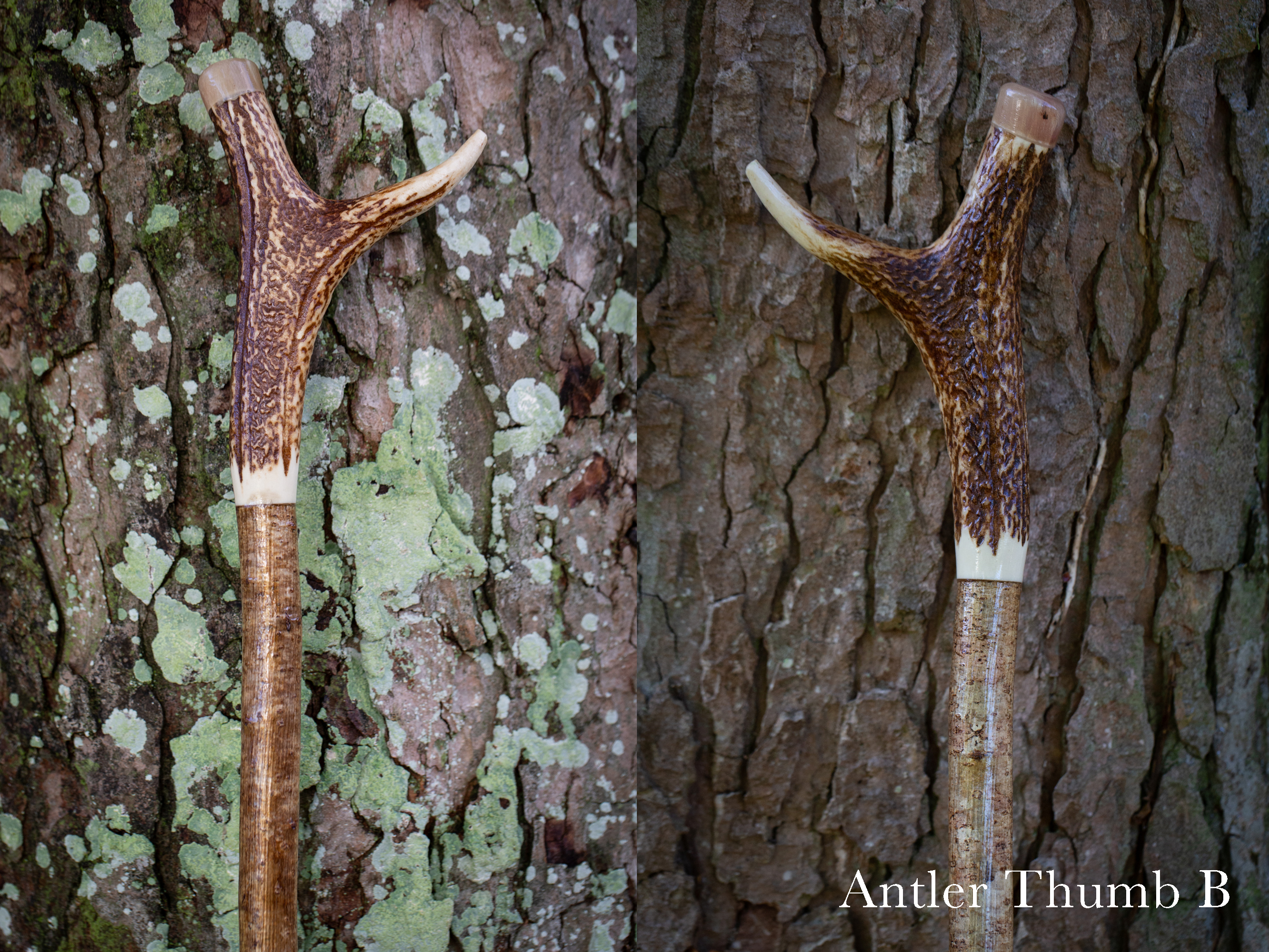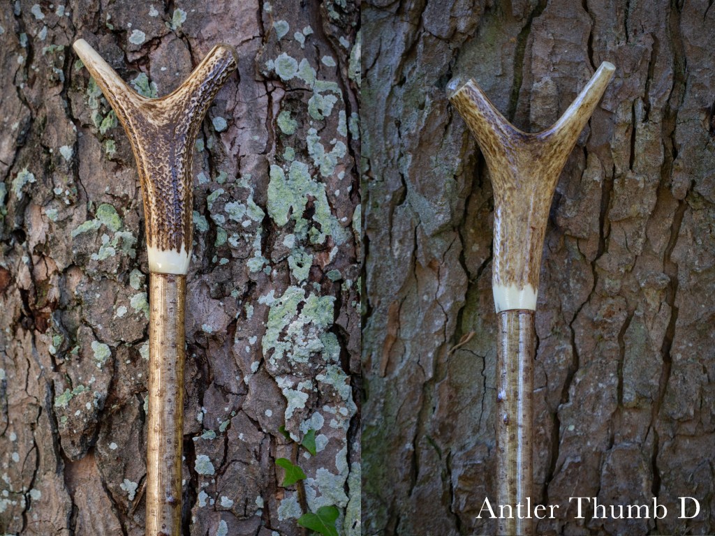 Antler thumb stick A is a lovely piece of antler on a silvery hazel shank measuring approx 51″ to the v and capped in Ox horn. Nice and dark on one side and whiter on the reverse, its a nice looking stick looking for a country ramble. Feels better in the right hand than the left – £65 SOLD JK